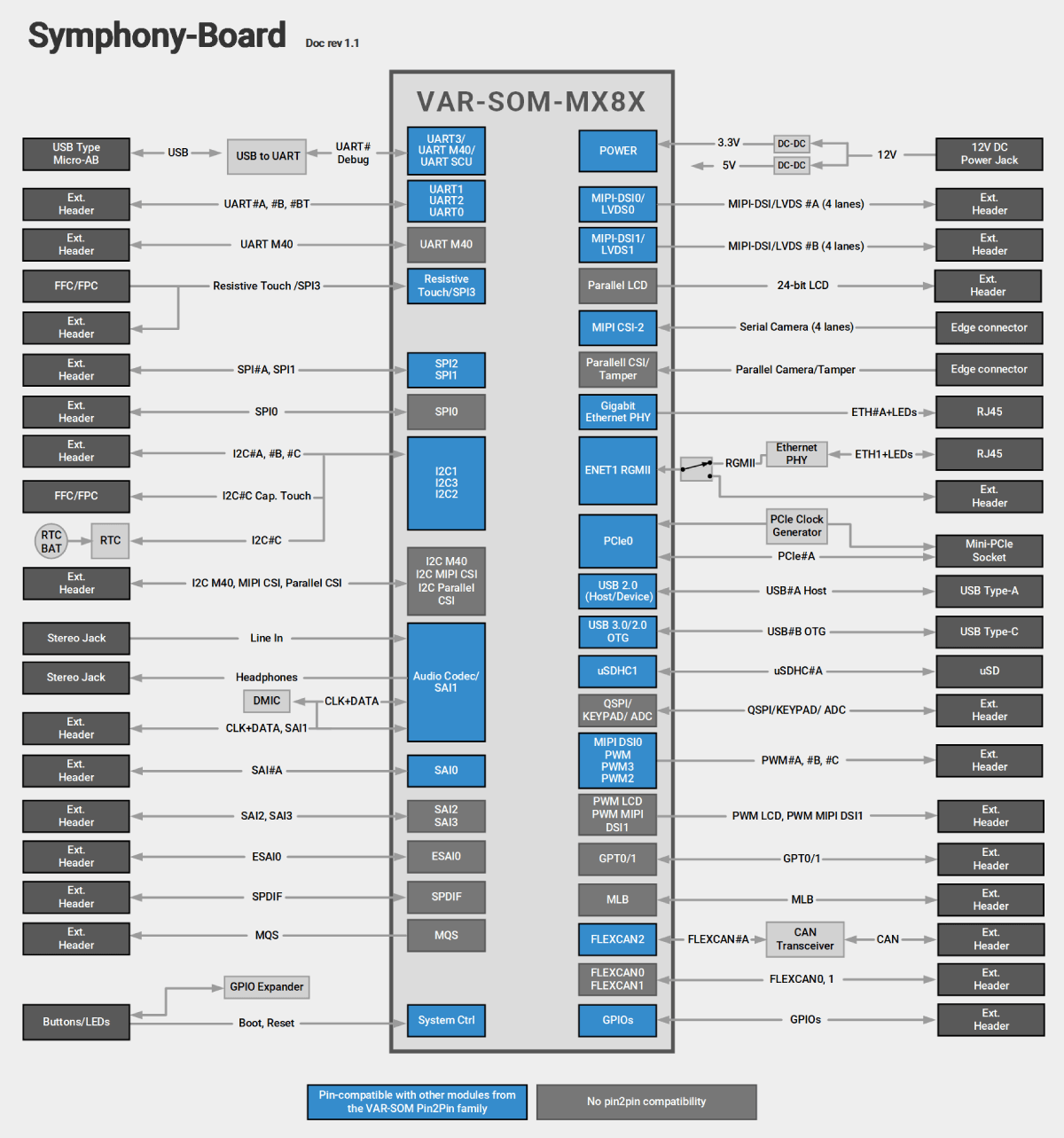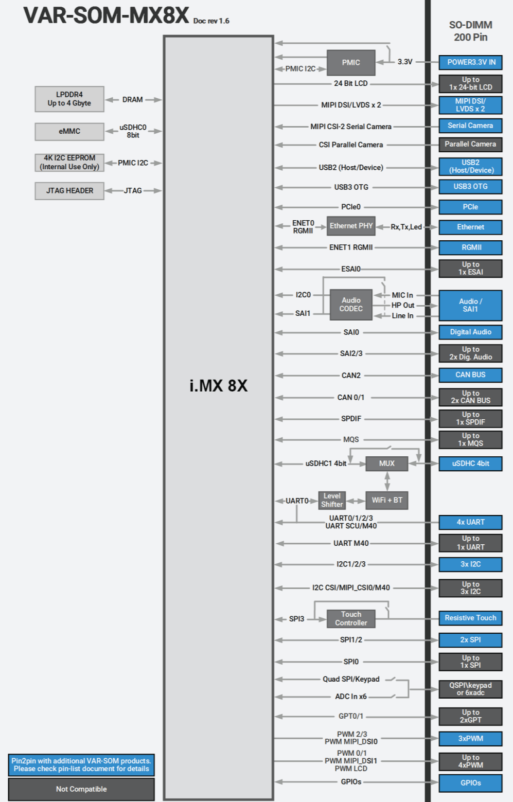 VAR-SOM-MX8X는 VAR-SOM-MX8, VAR-SOM-MX6 및 VAR-SOM-SOLO / DUAL과 호환이 가능합니다. 이 제품은 고객들에게 높은 수준의 확장성과 연장된 수명 가용성을 제공하고 개발기간과 비용, 위험 등은 줄여줍니다. 고성능이지만 최적화된 전력 소비를 보여주는 VAR-SOM-MX8X는 NXP의 i.MX 8X 1.2GHz Quad Cortex ™ -A35 와 Cortex-M4F를 탑재하여, 내장된 안전 기능과 4K를 지원하는 고도의 통합 멀티미디어 및 효율적인 전력 / 성능 아키텍처를 제공합니다. 또한 고도로 통합 설계되어 산업 자동화 및 제어에서부터 방위, 의료, 텔레매틱스, 빌딩 제어, 페일오버 디스플레이/HMI 및 로봇 공학까지 광범위한 신뢰성이 높은 전력 효율적 애플리케이션을 지원합니다.
