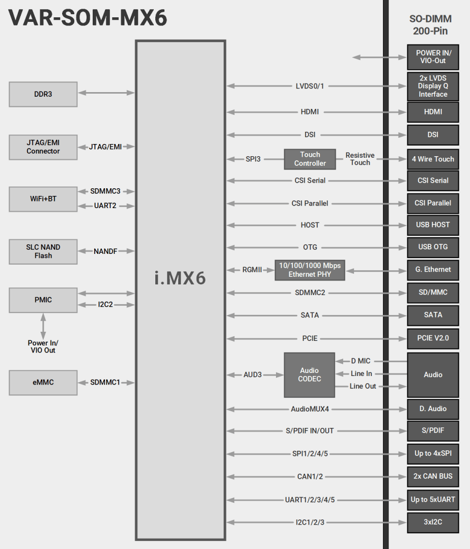 VAR-SOM-MX6는 NXP i.MX 6 1.2 GHz QuadPlus / Quad / Dual / DualLite / Solo Cortex-A9 ™ 프로세서를 지원합니다. VAR-SOM-MX6의 뛰어난 확장성은 향후 가장 까다로운 애플리케이션 요구사항을 충족하며, 다양한 시장 옵션을 지원하기 위해 시간과 비용이 많이 드는 재설계의 필요성을 제거합니다. 4개의 CPU 어셈블리 옵션은 광범위한 연결성, 빠른 처리 성능, 향상된 알고리즘 또는 개선된 그래픽 및 비디오 성능을 수용할 수 있습니다.